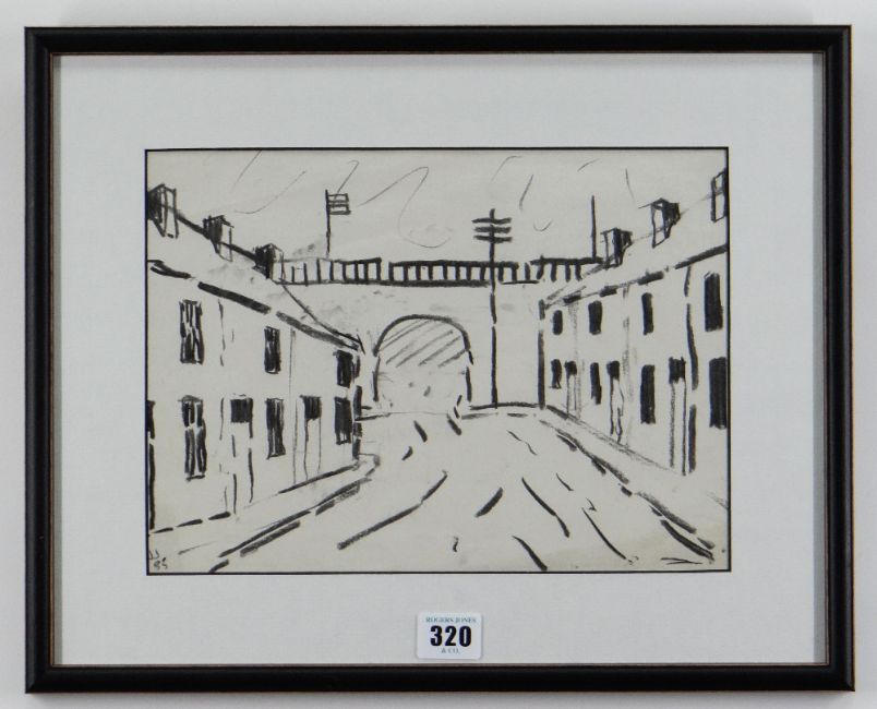 JACK JONES charcoal - street scene with railway bridge, signed with initials and dated 1985, 21 x 28cms