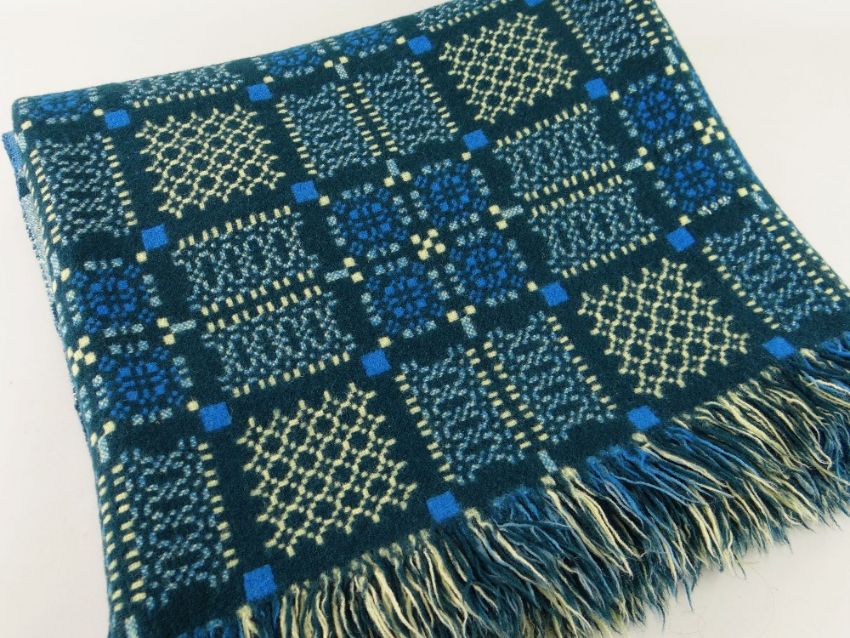 VINTAGE WELSH TAPESTRY BLANKET of geometric design, racing-green ground with yellow and blue detail, fringe, 210 x 150cms