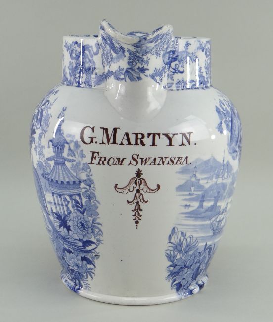 A BLUE & WHITE SWANSEA POTTERY DOCUMENTARY JUG IN THE ORIENTAL BASKET TRANSFER of baluster form, spurred loop handle, wide collar, inscribed in chocolate brown 'G MARTYN FROM SWANSEA', base with pattern name in cartouche, 26cms high