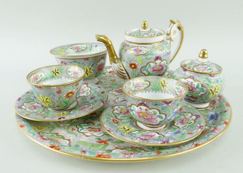 Comments: small chip to underside of saucer, repair to finial of sucrier, professional restoration likely, examination in person highly recommended, rare and complete