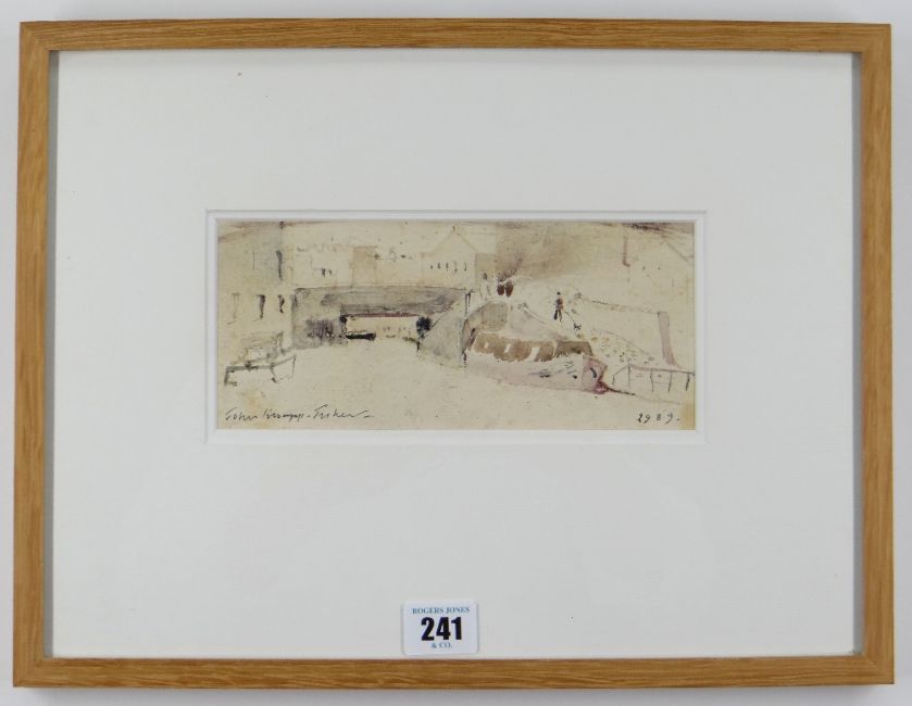 JOHN KNAPP-FISHER watercolour - canal scene with figure and dog, entitled verso on Albany Gallery label 'Regent's Canal, N. London', signed and dated 1989, 8.5 x 20cms