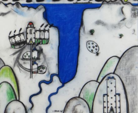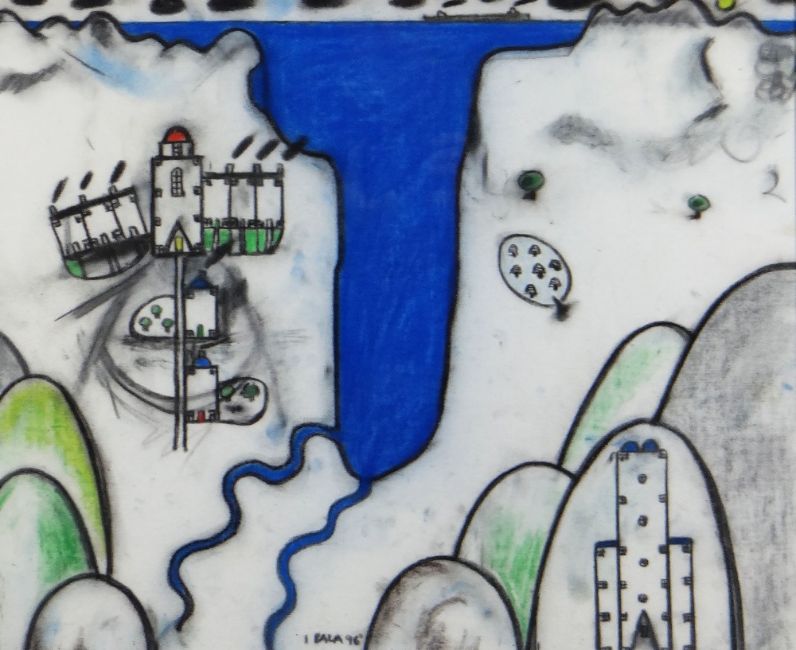 IWAN BALA mixed media on linen - graphic of coastal scene with lighthouse, terraced houses and castle, signed and dated 1996, 47 x 56cms