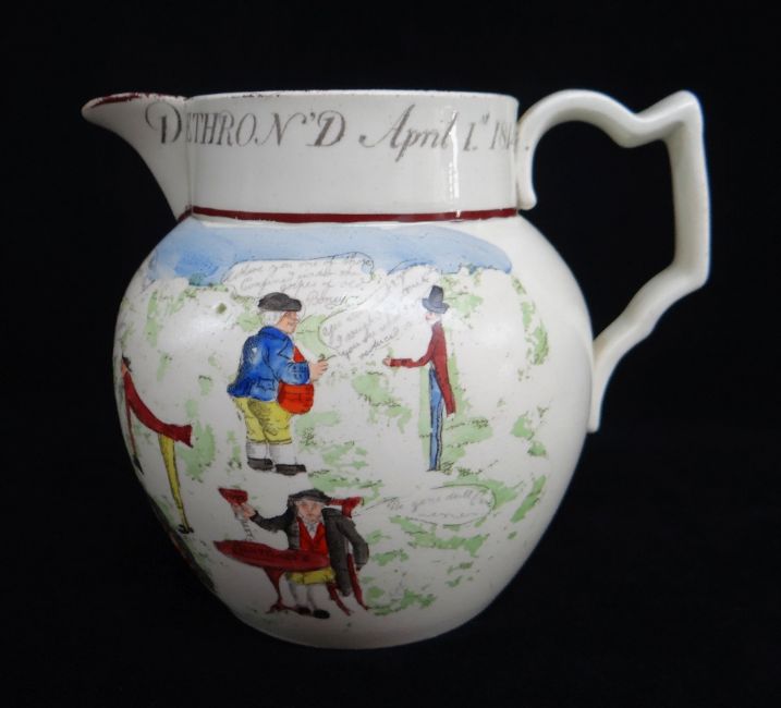 SWANSEA PEARLWARE POTTERY SATIRICAL JUG concerning Napoleon 'BONAPARTE DETHRON'D April 1st 1814, 14cms high