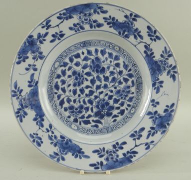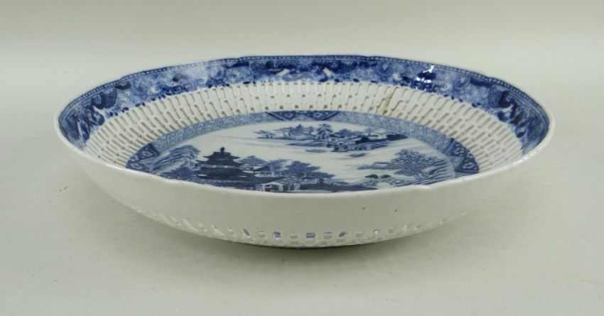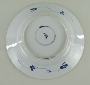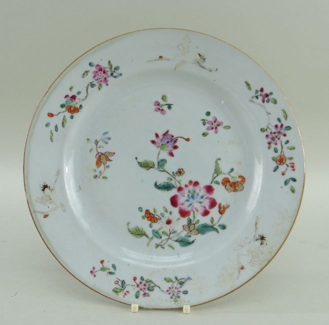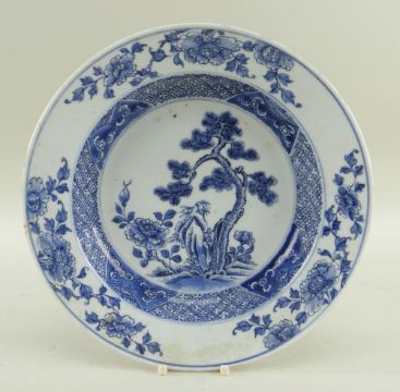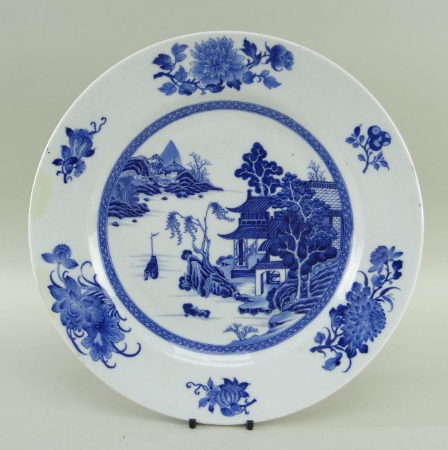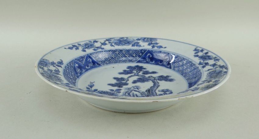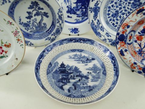 SIX CHINESE EXPORT PORCELAIN DISHES, Qing dynasty, comprising Chinese Imari plate, 23cms diam; famille rose Manchurian crane and lotus plate, 22.5cms diam; blue and white pine and peony soup plate, 22.5cms diam; blue and white pierced cavetto landscape saucer dish, 26cms diam; blue and white scrolling lotus dish, 26.8cms diam.; blue and white pencilled river landscape dish, 27.8cms diam. (6)