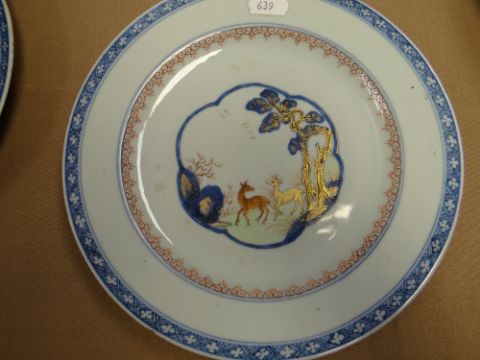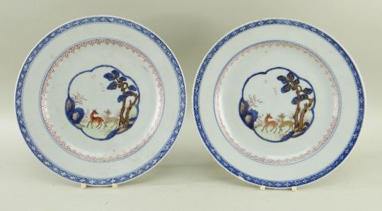 PAIR CHINESE ENAMELLED BLUE & WHITE PLATES, Qianlong, each centre decorated with a pair of deer beneath pine tree within lobed panels, iron red cloud collar border, diaper rim, 23.2cms diam. (2)