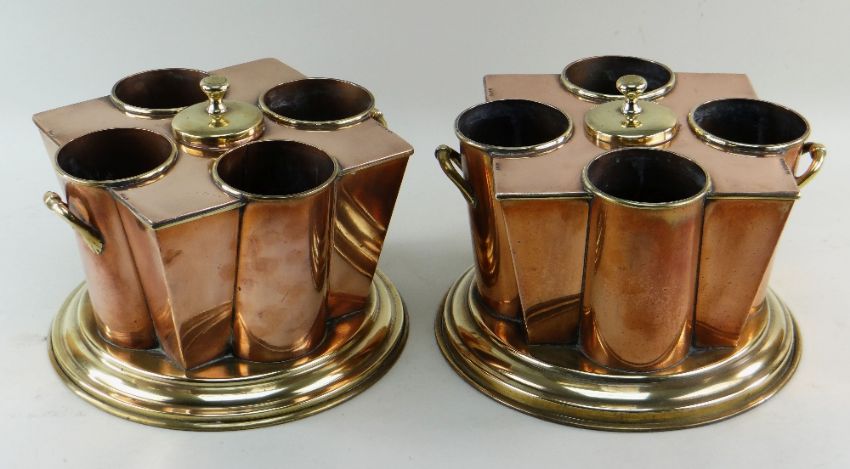 PAIR COPPER & BRASS WINE COOLERS, each with four bottle sleeves around a central lidded ice container, stepped circular base, tops stamped 'S.S. Boston' and 'White Star', 31.2 d. x 23.5 cms h.