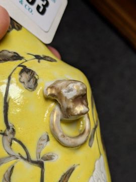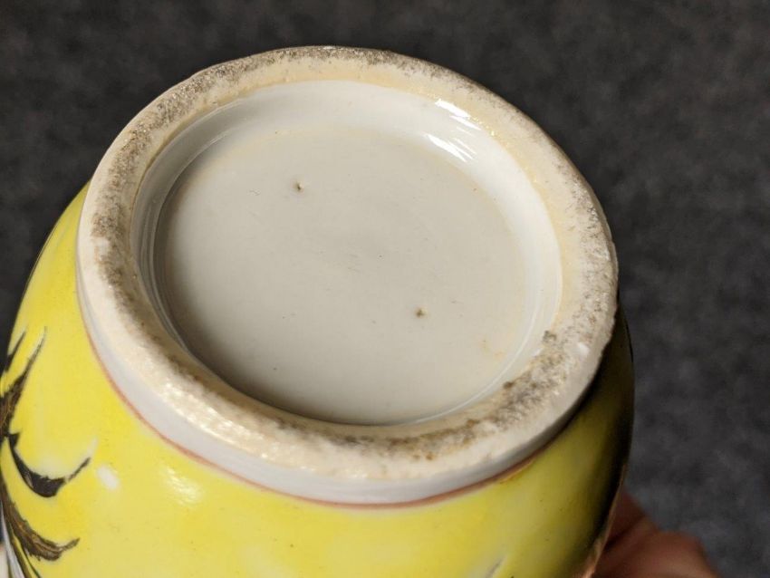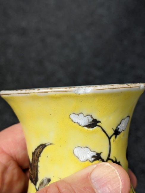 Comments: one with two small rim chips, both with rubbed gilt rims and handles, one handle with glaze chip, both slightly wobbly, bases lack any reign or seal marks.