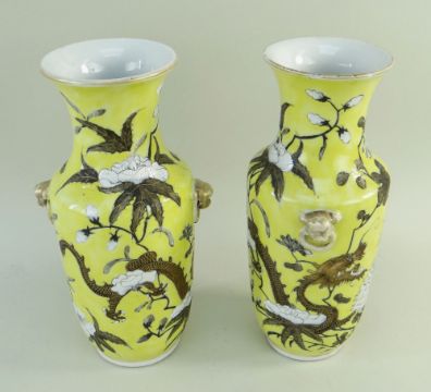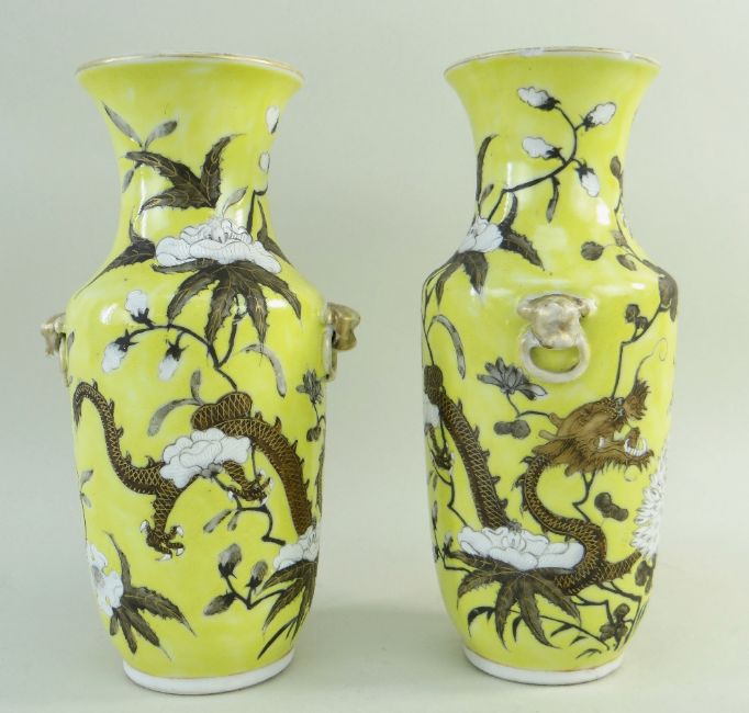 PAIR CHINESE 'DOWAGER EMPRESS DAYAZHAI' TYPE PORCELAIN VASES, 20th Century, shouldered form with fixed ring lion mask handles, painted en grisaille and white enamel to a yellow ground with sinuous 4-clawed dragon amid flowering chrysanthemum and hibiscus (denoting Autumn), gilt highlights, 20.5cms h (2)