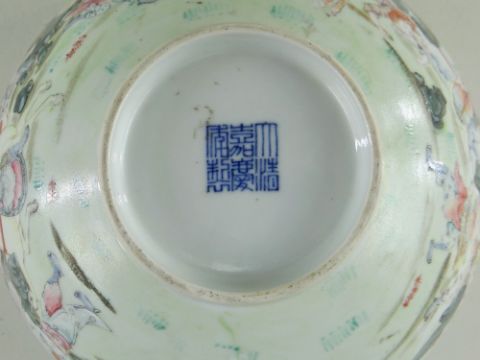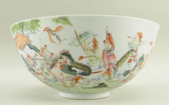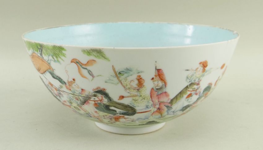 CHINESE FAMILLE ROSE BOWL, Jiaqing mark and probably period, the outside decorated with a broad frieze of warriors in combat on foot and on horseback, with bladed weapons, banners and demon mask shields, turquoise interior, underglaze blue 6-character zhuanshu mark, 21.2cms diam.