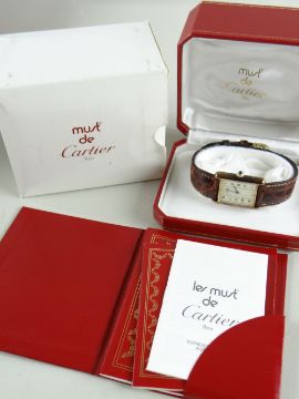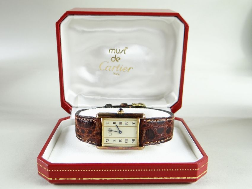 MUST DE CARTIER VERMEIL SILVER GILT TANK LADY'S WRISTWATCH, ref. 590005, no. 1****5, c. 1997, champagne dial with two vertical columns of Roman numerals, cabouchon crown, quartz movement, fitted brown Cartier strap, 23mm. diam., box and papers.