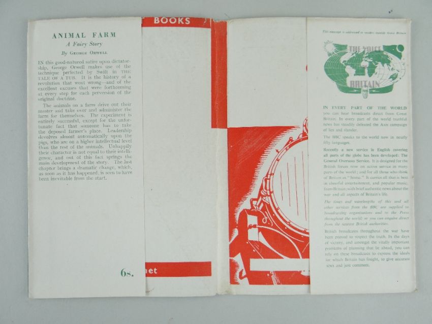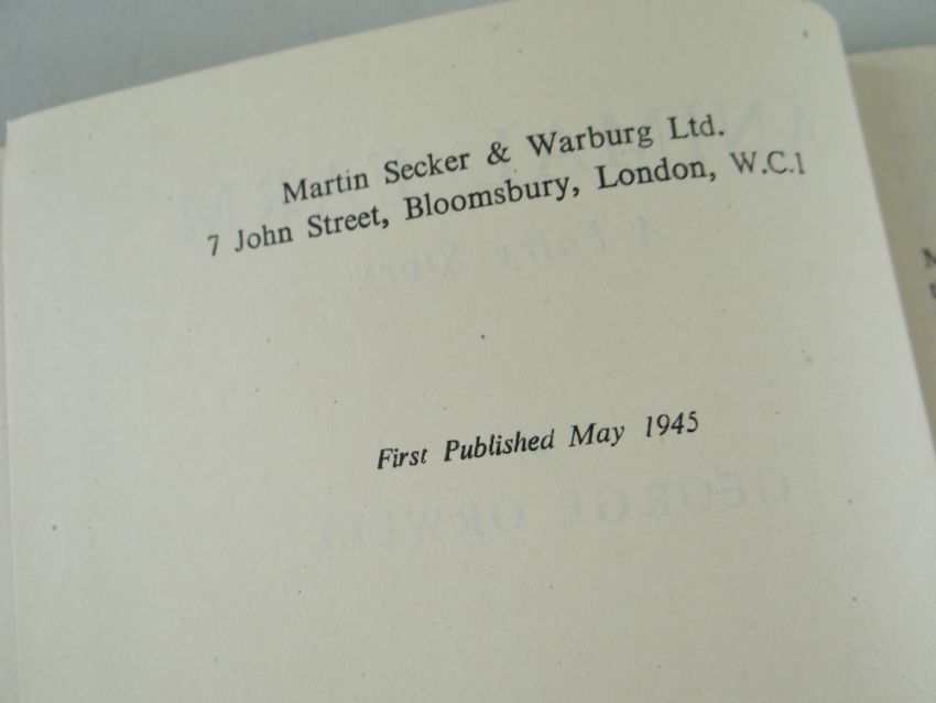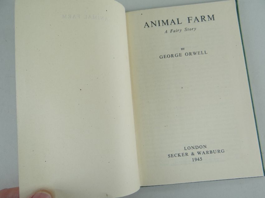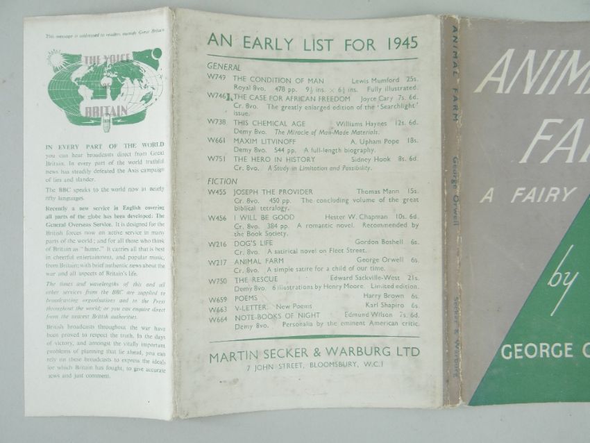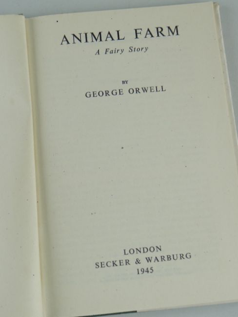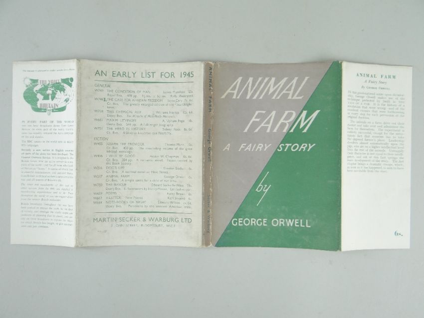 ORWELL (GEORGE) ANIMAL FARM: A FAIRY STORY, FIRST EDITION, publisher's green cloth, spine lettered in white, dust jacket with front flap priced '6s' and 'Searchlight Books' design on verso [Connolly 93], 8vo, Secker & Warburg, 1945.