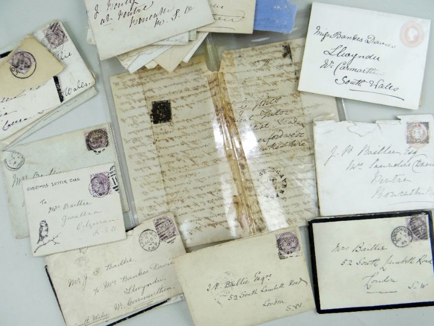 STAMPS: INTERESTING GROUP OF VICTORIA COVERS, including 2-page letter with 1841 Haverfordwest cancellation mark on 1d black entitled 'Reflections' (on Biblical text) to T.G Jones, Special Tutor, Baptist Academy, Haverfordwest, together with 18 other covers with cancellation marks dated 1871-1899 on 1d reds, 4d vermilion, 1/2d vermilion, 1/2d bantam (on Inspector of Nuisances document), some corner torn covers fragments, several other pre-printed/impressed duty covers,and an Imperial Russian cover with 1891 cancellation on a 7 kopek blue (42)