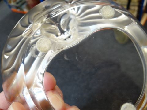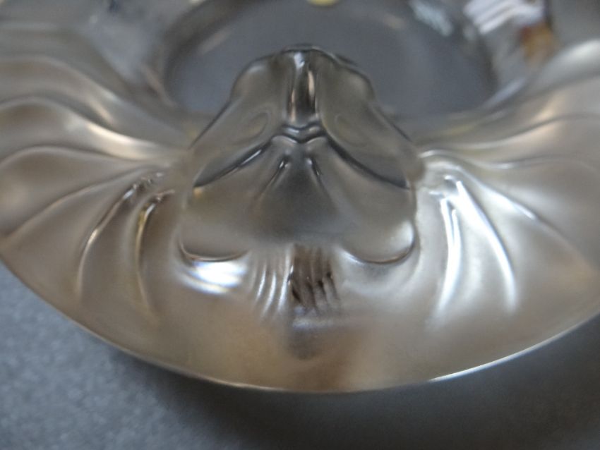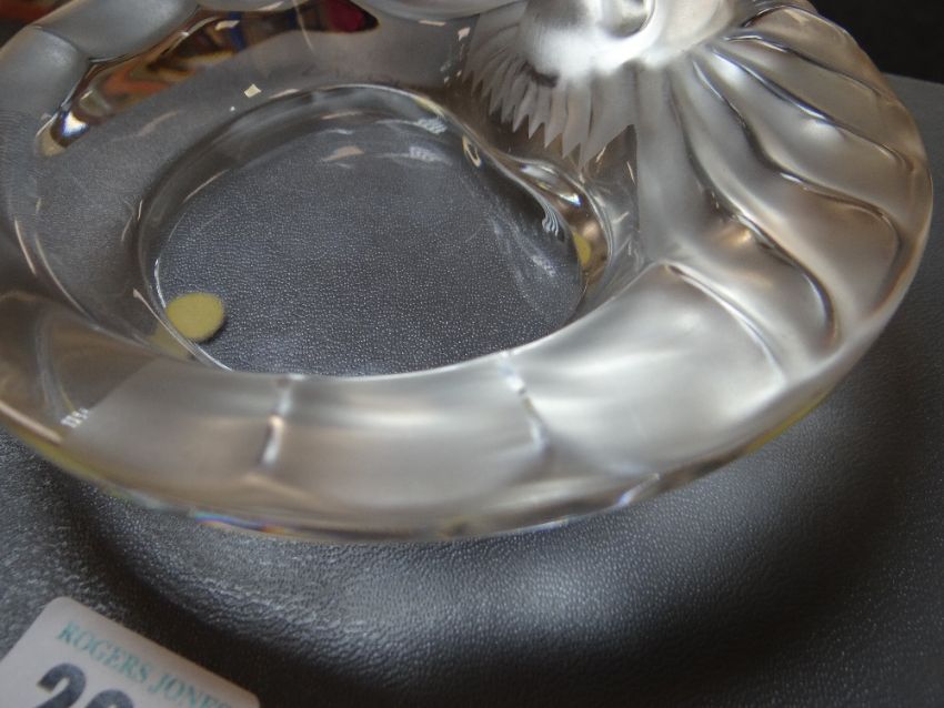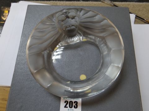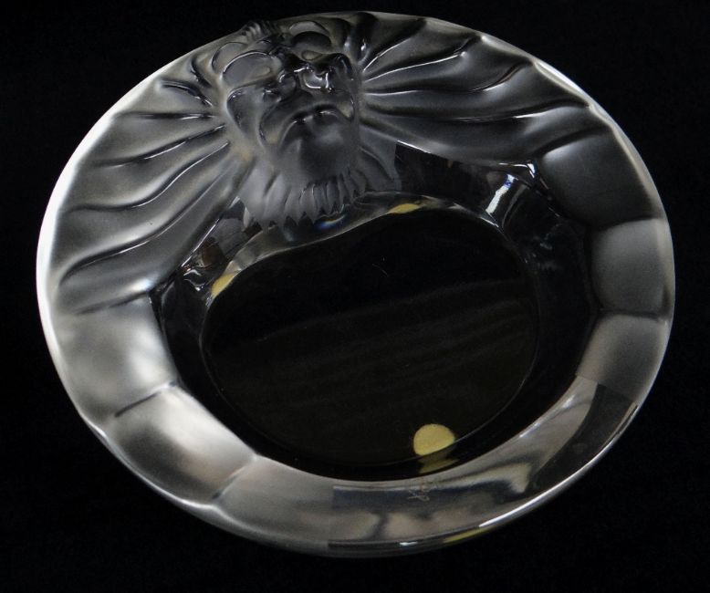 CRYSTAL LALIQUE FROSTED GLASS 'LION' DISH, no. 10743, 14.5cms diam, boxed.There is one single scratch on the underneath (see photographs).Also a little dirty, no other damage.