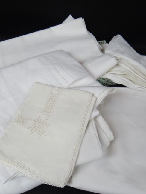 ASSORTED DOMESTIC WHITE LINEN, including twelve sheets, three table cloths, and various small cloths (qty)