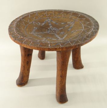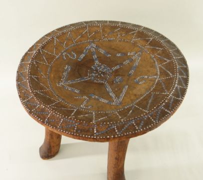 KAMBA STOOL, Kenya, dished circular seat, decorated with blue/white beads, 34cms diameter