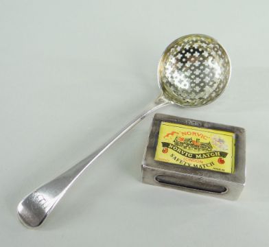 GEORGE III SILVER SIFTING SPOON, London 1811 William Eley Fearn & Chawner, handle with mahogany, bowl gilded, 15cms long, and a George V matchbox holder, total approximate weight 1.9ozt (2)