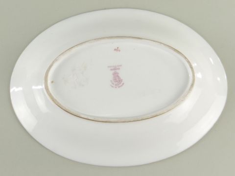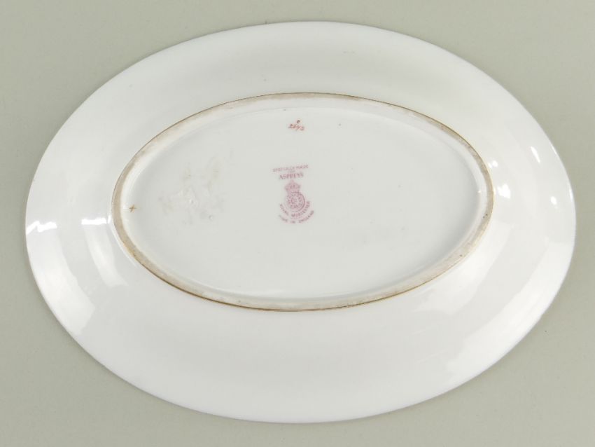 ROYAL WORCESTER JAMES STINTON PAINTED DESSERT DISH, dated 1938, retailed by Aspreys, centre decorated with a scene of mallard in reeds, within elaborate gilt frame on a blue ground border, gilt rim, puce printed marks, 27cms wide.