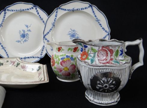 Comments: Supper dish chipped and stained, jug enamels both worn, Cambrian jug restored spout, one plate chipped