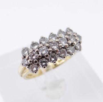 18CT GOLD TRIPLE ROW DIAMOND RING having 19 diamonds in total measuring 0.05cts each approx. (visual estimate), ring size L / M, 5.5gmsComments: no apparent dmage, diamonds all seem sound, shank with normal wear scratches, slighly compressed.