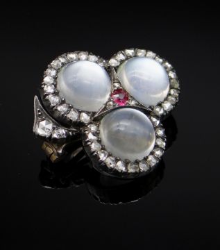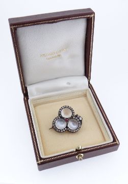 VICTORIAN MOONSTONE, RUBY & DIAMOND BROOCH of trefoil foliate design, in white metal, presumed silver frame with yellow metal, presumed gold pin 3cms long, 8.7gms, in Richard Ogden (London W1) jewellery boxComments: diamonds rose-cut, ruby of good colour, pin gold, moonstones well matched, nicley domed and polished.