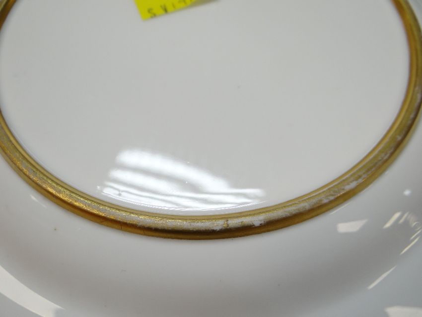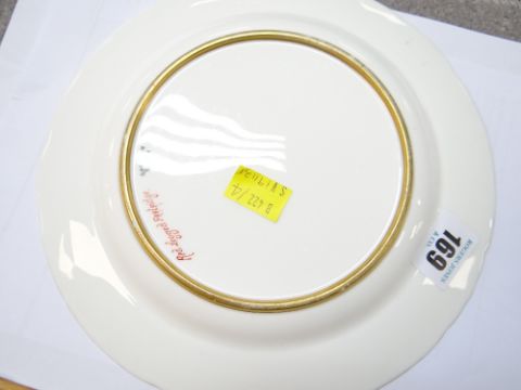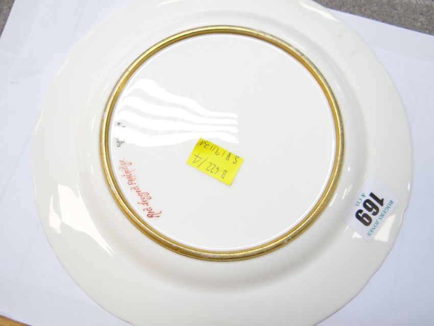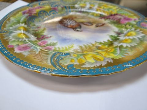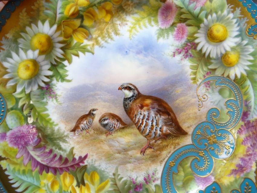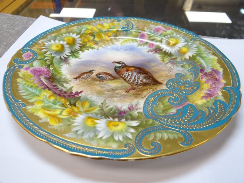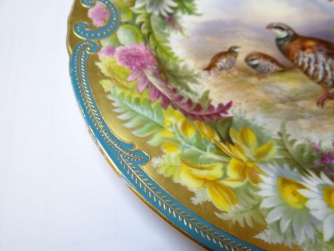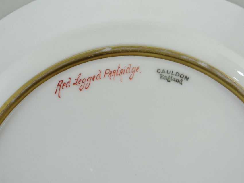 CAULDON PORCELAIN PAINTED CABINET PLATE, centre with partridges in landscape by J. Birbeck Senior within wildflower sprays by S. Pope, on turquoise and gilt scroll border, gilt foot ring, reverse titled in red script, 'Red Legged Partridge', 22cms diam.gilt loss to rim and footing