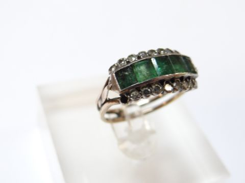 TWO DIAMOND RINGS comprising 18ct gold and platinum illusion set three stone diamond ring together with an emerald and diamond triple row ring, 4.5gms overall (2)The three stone diamond is size L/MThe emerald is size MThere is one stone missing from the emerald