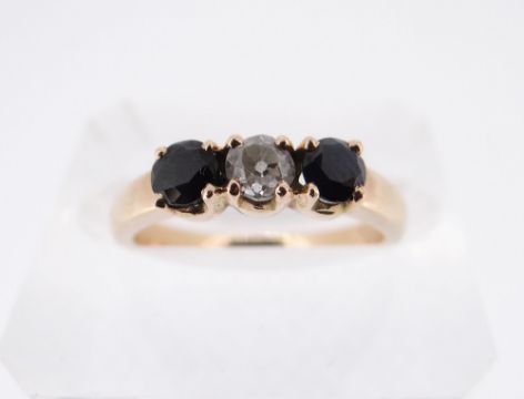 YELLOW METAL THREE STONE DIAMOND & SAPPHIRE RING, engraved 'K18', ring size M, 3.4gms
