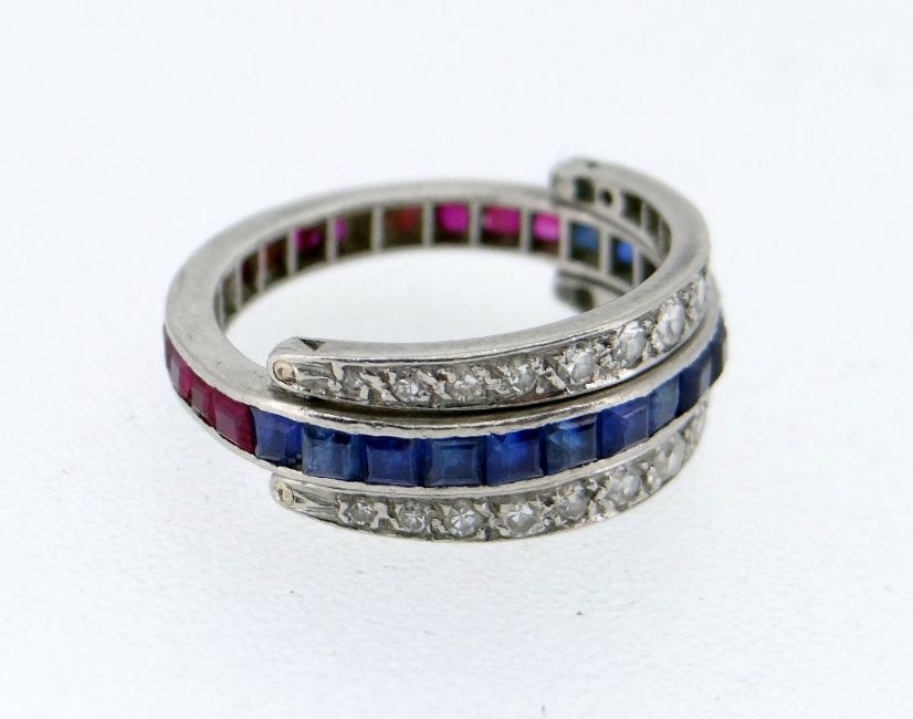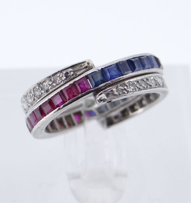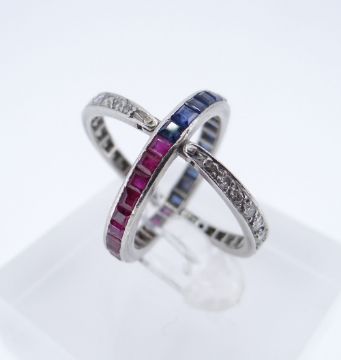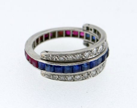 WHITE METAL DIAMOND, RUBY & SAPPHIRE REVERSIBLE RING, ring size L / M, 5.7gmsComments: stones well matched, probaly ennaced, some diamonds with flaws, unmarked white metal presumed gold but untested and not guaranteed.