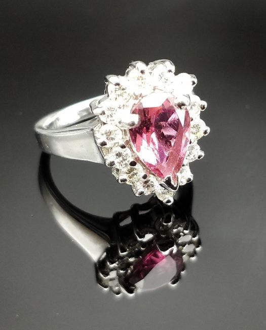 9CT WHITE GOLD TOURMALINE & DIAMOND DRESS RING, the central pear shaped pink tourmaline surrounded by fourteen diamonds, ring size M, 6.0gms