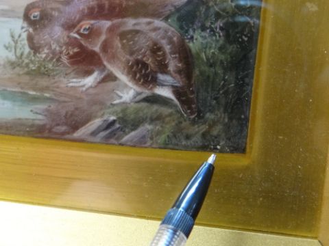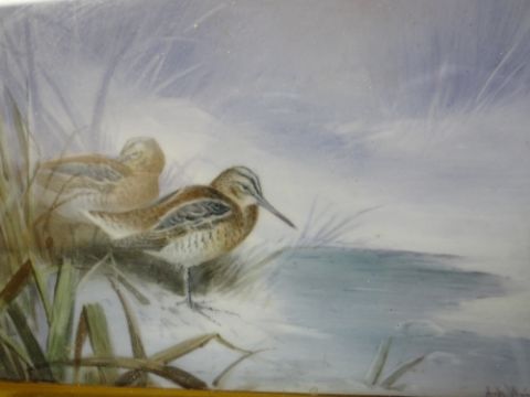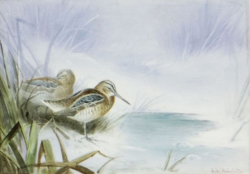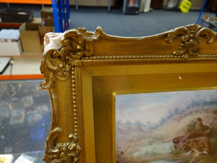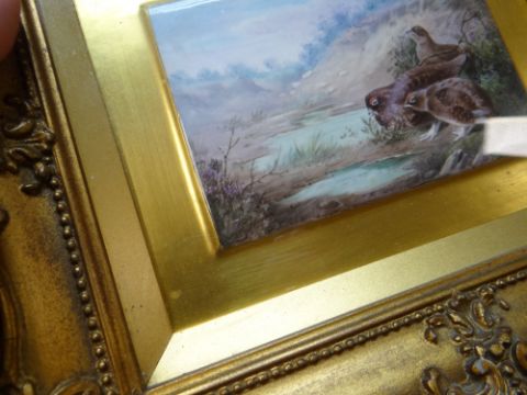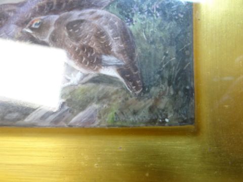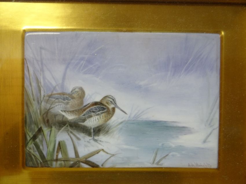 GOOD PAIR OF PAINTED PORCELAIN PLAQUES, by A. H. Wright depicting grouse and woodcock, within broad gilded recessed borders, signed, the porcelain probably Mintons, 19 x 14cms, framed (2)few small paint chips on each plaques under the glassDamaged frames