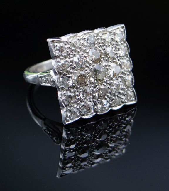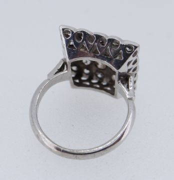 WHITE METAL DIAMOND ENCRUSTED RING, Art Deco style square design, ring size L, 6.0gms