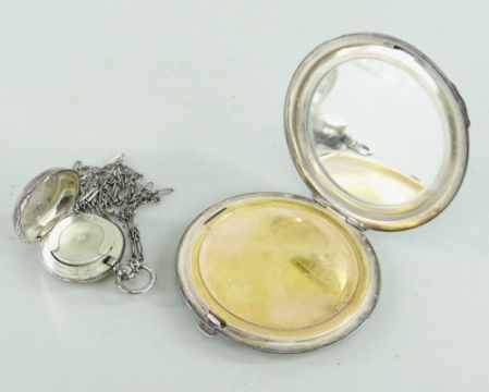 SILVER COLLECTIBLES comprising silver engine turned and blue guilloche enamel powder compact, and silver circular sovereign case on white metal chain (2)