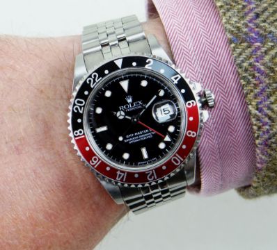 Comments: recently serviced. Dial: good. Movement: running at present, not tested for accuracy. Hands: lume cracking in GMT arrow and 2 others. Bezel: v. light scratches Crown - adjusting correctly. Case: good , with some v. light scratches due to general use. Strap/Bracelet: good, hardly stretched, clasp not closing properly.