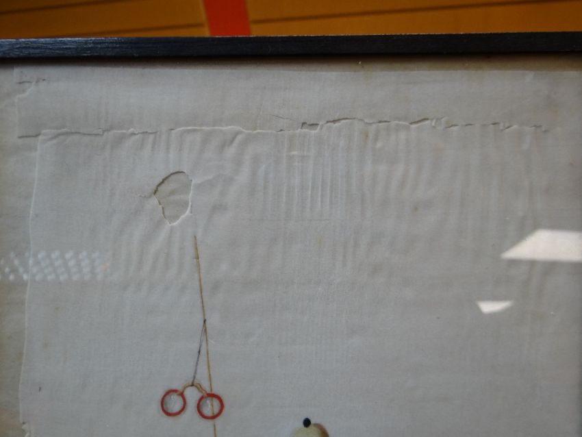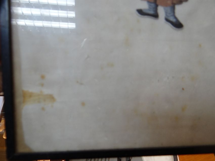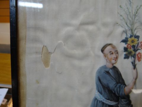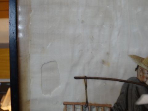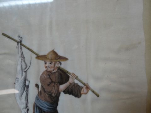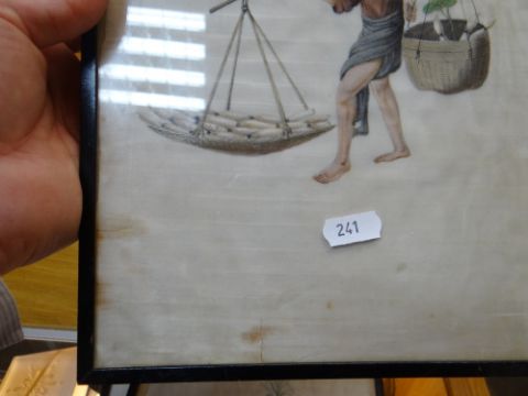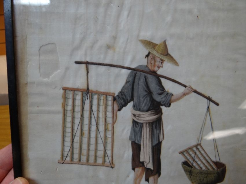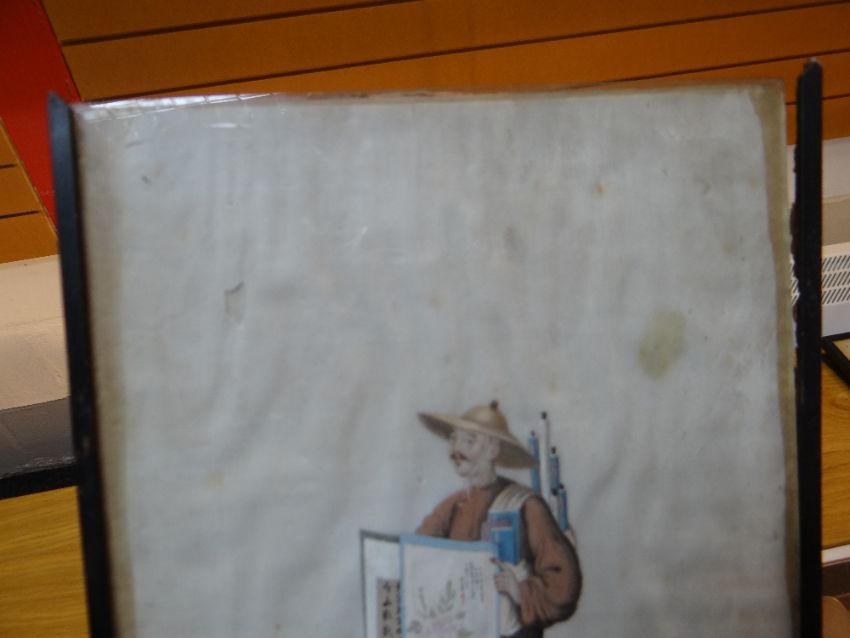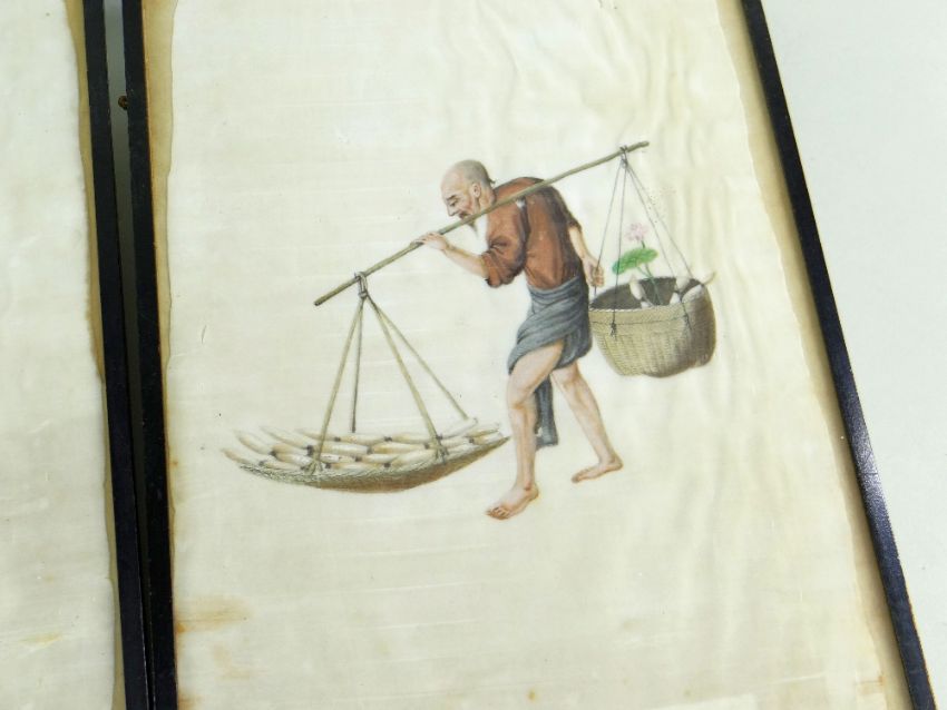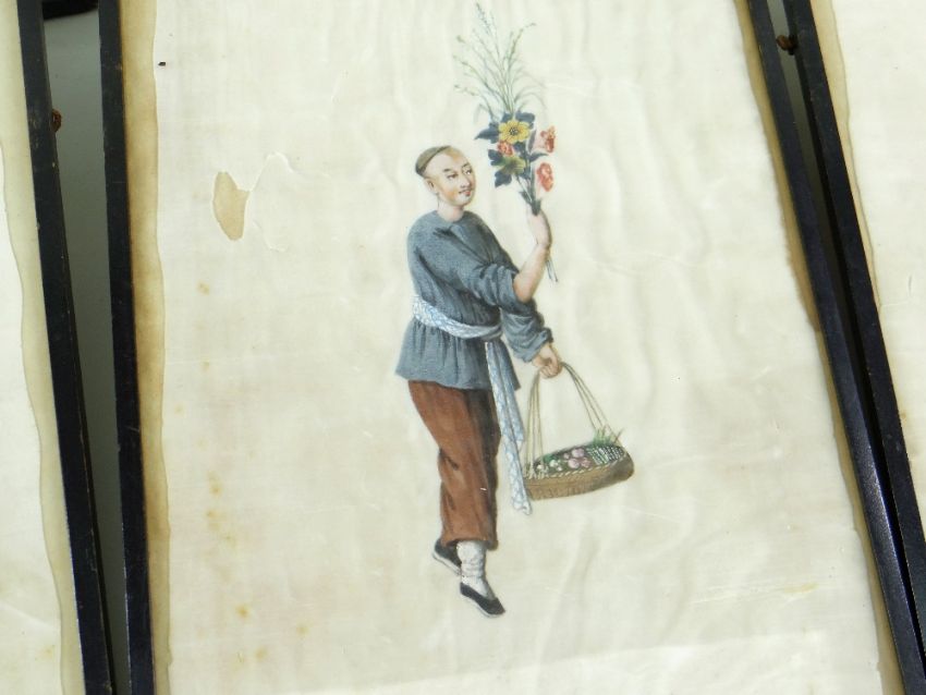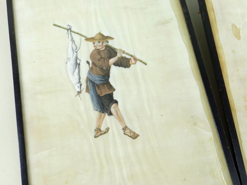 SET SIX CHINESE PAINTINGS ON PITH, depicting street vendors including scroll seller, spectacles seller, lotus root seller, flower seller, dog meat seller, and paper seller, in ebonised frames, 34 x 20cms Comments: damaged margins, wrinkled, one frame missing top.All pictures have damaged pith, there are various rips and tears on all and on some pictures the pith is missing.There is staining and rippling and one frame is damaged.