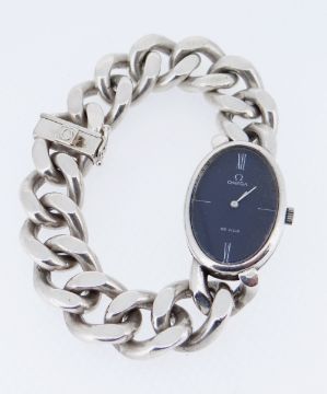 LADIES OMEGA DE VILLE WRISTWATCH, oval dial, encased in silver with chunky silver curb link bracelet