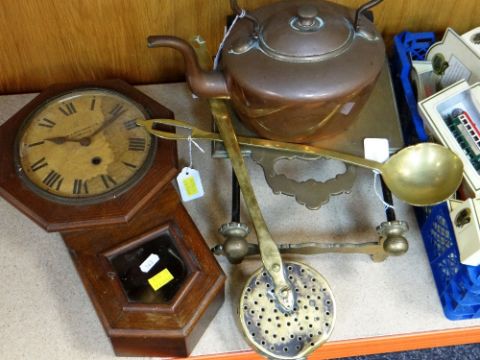 CHARITY LOT: assorted collectibles, including vintage pigskin vanity case with accessories, various boxed diecast vehicles, brass chestnut roaster, warming pan, trivet, kettle, books of Welsh and Jewish interest, & wall clock.