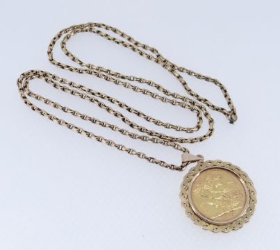 ELIZABETH II GOLD SOVEREIGN, 1979, in 9ct gold pendant mount on 9ct gold chain, 21.7gms