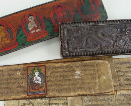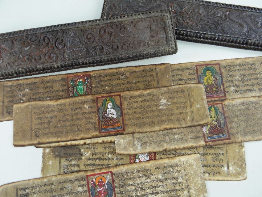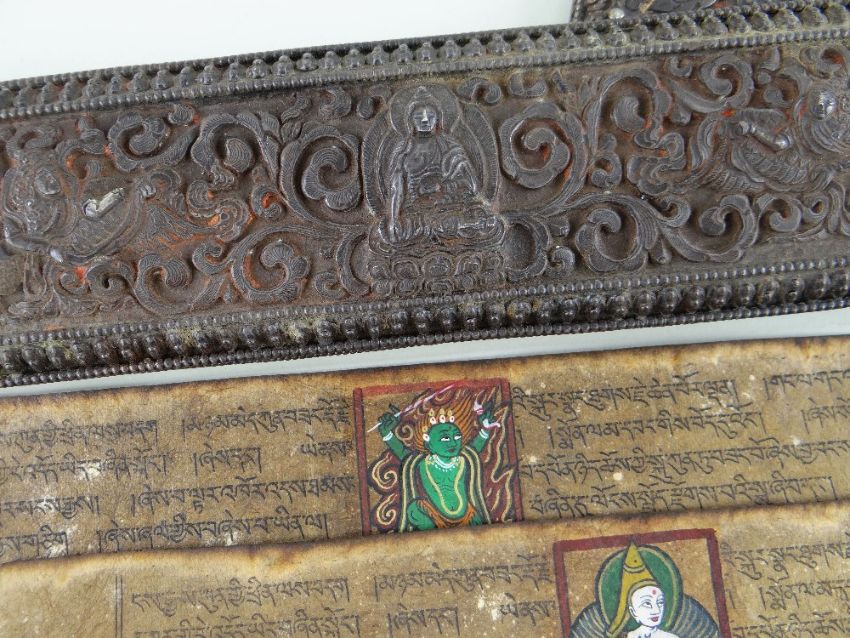 TIBETAN BUDDHIST SUTRA, 20TH CENTURY , with ten double-printed pages in Sanscrit with illuminations of bodhisattvas within white metal embossed wood boards, internally decorated with bodhisattvas, 7.5h x 33w x 2cms