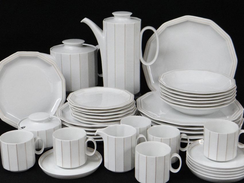 TAPIO WIRKKALA FOR ROSENTHAL: STUDIO LINE TABLE SERVICE, faceted with vertical gilt lined highlights, six each o cereal, side, salad and dinner plates, coffee cans, saucers, coffee pot, teapot, milk jug and sugar basin