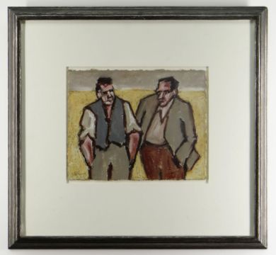 MIKE JONES mixed media - two figures, entitled verso 'Men in Landscape', signed, 20 x 25cms