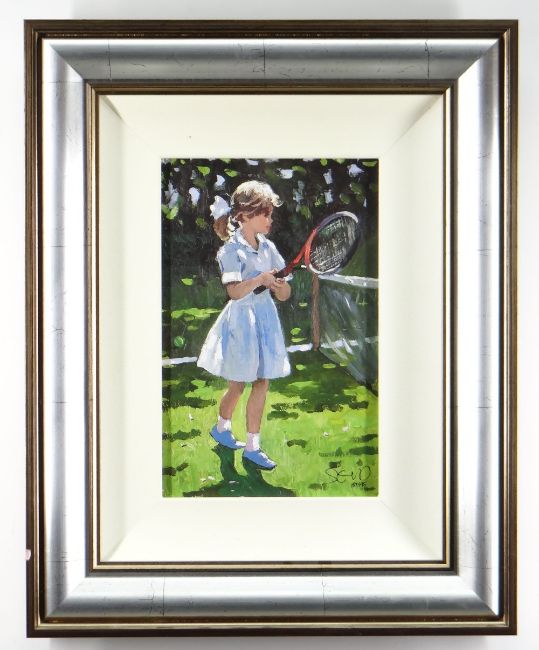 SHERREE VALENTINE DAINES limited edition (157/195) giclee print on canvas board - Playful Times I, girl with tennis racket, signed and numbered, COA verso from DeMontford Fine Art, 31.5 x 20cms