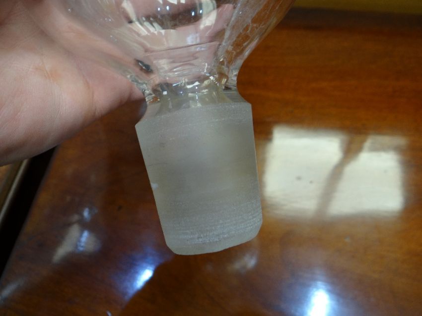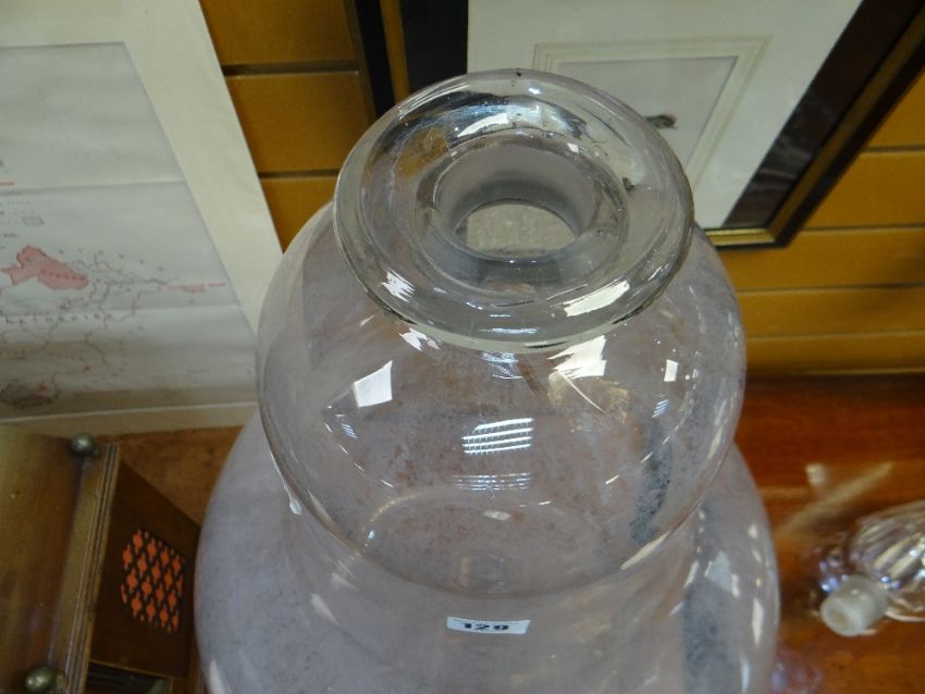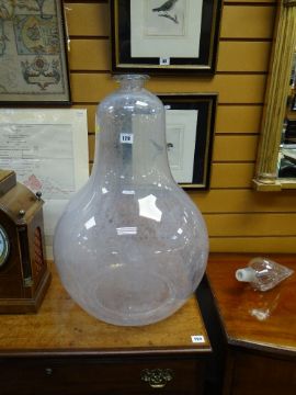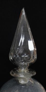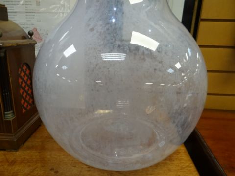 IMPRESSIVE & LARGE CLEAR GLASS PHARMACY DISPLAY BOTTLE OR CARBOY, of pear shape with faceted spire stopper, 90cm high Comments: glass with cloudy deposit inside, small chips to stopper.The stopper is loose, fits nicely. There is a chip to the very top of the stopper. No other damage.No cracks or chips to the body, unsure if watertight, I would think it was, looks fine, just cloudy with some sort of residue on the inside.