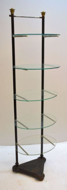 CAST IRON TIERED SHOP DISPLAY STAND, by T. Griffiths & Co, Stirchley, Birmingham (stamped to base), with five glass oval shelves, later brass finials, 186cms h