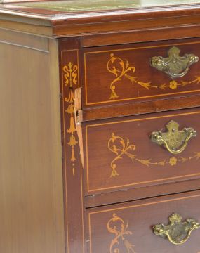 VICTORIAN MARQUETRY WRITING DESK with tooled leather surface, two stationery boxes, and an arrangement of nine drawers, tapering square legs, casters, 104h x 130w x 56cms