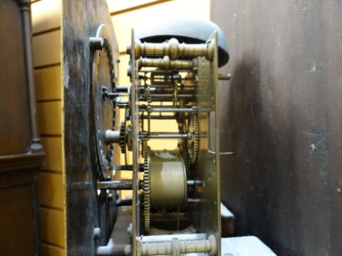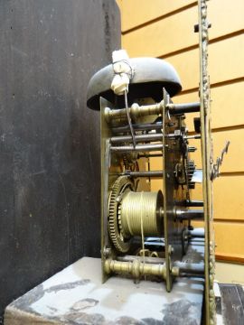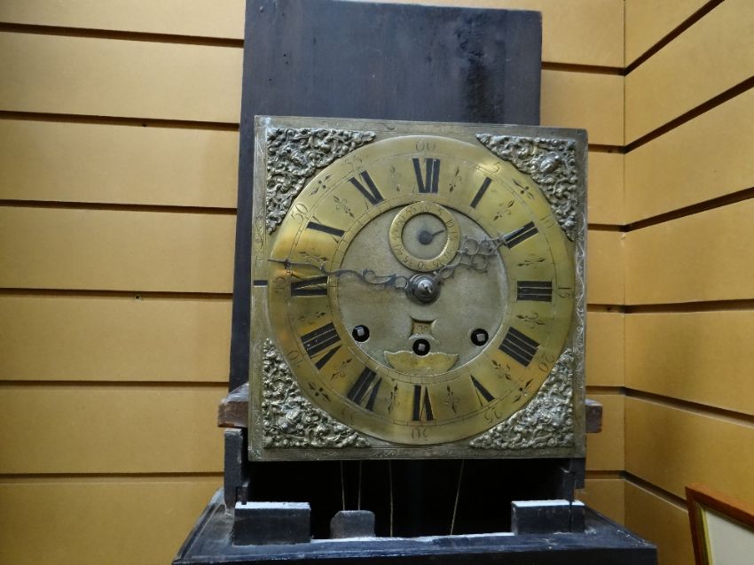 18TH CENTURY EIGHT DAY OAK LONGCASE CLOCK, Richard Liscombe, Moreton, 10-inch Roman brass dial, with subsidiary seconds and calendar aperture, matt centre, pierced spandrels, signed on cartouche, in later carved and stained case, 204.5cms high