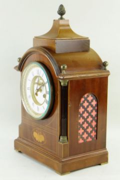 20TH CENTURY BOXWOOD STRUNG MANTEL CLOCK, in the form of a bracket clock, two piece enamel dial with visible brocot escapement, replaced 8 day movement, case with ebonised stop fluted columns and inlaid butterfly, 48cms high