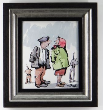 GEORGE SOMERVILLE watercolour - Happiness Isn't Complicated, man and woman with their dogs conversing, signed, DeMontfort Fine Art label, Castle Galleries COA, 24 x 20cms