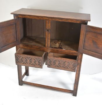 17TH CENTURY-STYLE OAK CUPBOARD, narrow rectangular top above pair of lozenge carved doors, and two apron drawers, style uprights, bar stretchers, 114h x 97w x 35.5cms