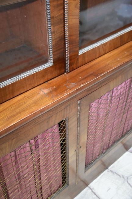 19TH CENTURY MAHOGANY BOOKCASE with shaped cornice, reel moulded glazed doors enclosing adjustable shelves, on a cupboard base with later gilt metal grill and satin backing, probably reduced in height, 224h x 173.5w x 43cms