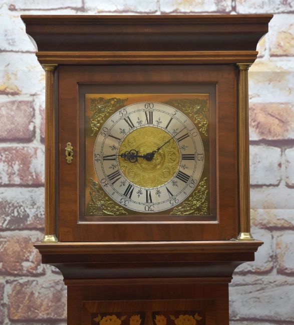 MODERN QUEEN ANNE-STYLE MARQUETRY LONGCASE CLOCK, engraved dial with brass spandrels, floral inlaid door with circular window, on inlaid base, square hood with brass inlaid columns and pierced brass sounding holes, 205cms high